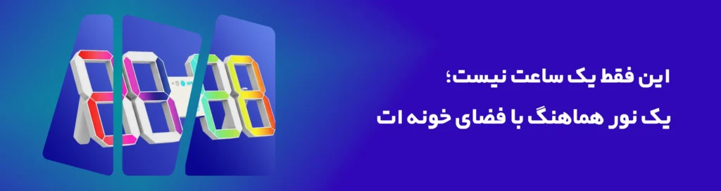این ساعت دیجیتال با طراحی مینیمال، نمایش دقیق زمان و دمای محیط را ارائه میدهد. با ریموت IR و 16 رنگ نور قابل تنظیم است و امکان نصب دیواری یا سقفی دارد؛ گزینهای کاربردی و شیک برای دکور مدرن.