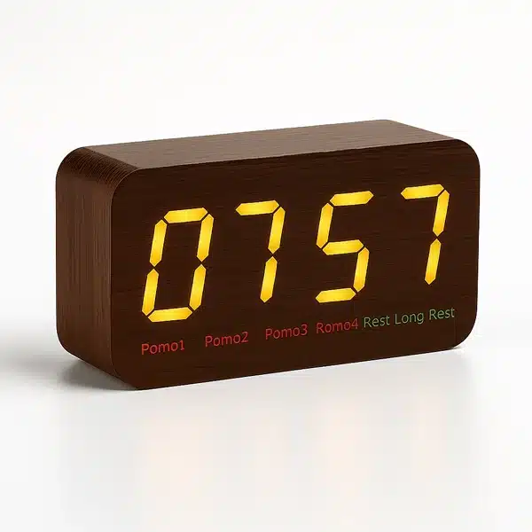 تایمر دیجیتال پومودورو هوشمند، راهکاری کامل برای اجرای تکنیک پومودورو (Pomodoro Technique) و مدیریت مؤثر زمان است. این دستگاه با طراحی شیک چوبی و نمایشگر LED بزرگ، به شما کمک می‌کند بازه‌های کاری ۲۵ دقیقه‌ای و استراحت‌های کوتاه ۵ دقیقه‌ای را به‌دقت پیگیری کنید. با استفاده از این تایمر پومودورو در کنار میز کار یا مطالعه، تمرکز خود را تقویت کرده و بهره‌وری خود را به سطحی بالاتر برسانید.